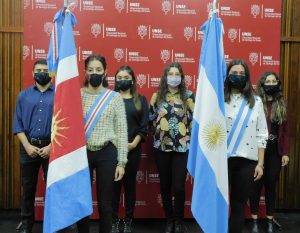 Los egresados y las egresadas, quienes se recibieron en pandemia, recibieron un reconocimiento por su perseverancia y compromiso: Liz Mikaela Rojas (FAyA), Nelson Leandro Paz (FCEyT), Martín Facundo Montenegro (FCF), Javier Ignacio Dargoltz (FHCSyS) y Jesica Judith Alejandra Espinillo (EIE).